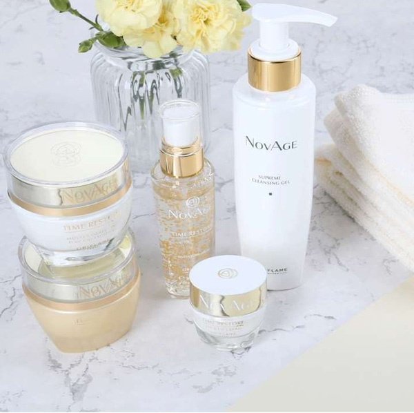ست مراقبت تخصصی پوست تایم ریستور نوایج از برند اوریفلیم، محصولات ضدپیری و ضدچروک قوی برای سن بالای 50 سال تولید نموده است. محصولات این ست شامل کالاهای ذیل هستند: