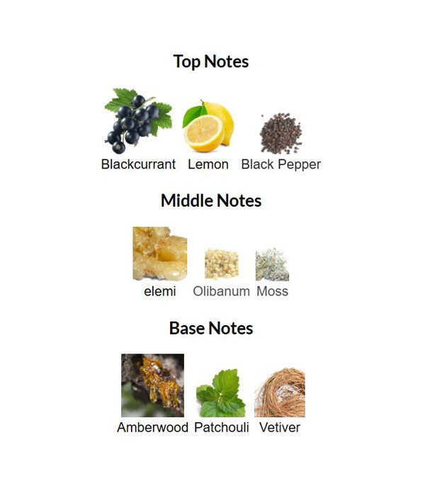 نتهای داینامیک فلفل سیاه از مرکبات و ادویهها عبور کرده و با نتهای آغازین لیمو و توت سیاه، عطر را با جذابیت خاصی باز میکنند. ویژگیهای رزینی لوکس عُلبَان در قلب عطر به ظهور میرسند و عمق مرموزی با نتهای مشابه بخور الِمی و خزههای خاکی ایجاد میکنند. نتهای قوی وتیور نجیب پایه را در بر میگیرند و با چوب کهربایی و پچولی غنی در یک مسیر چوبی برجسته ترکیب میشوند.